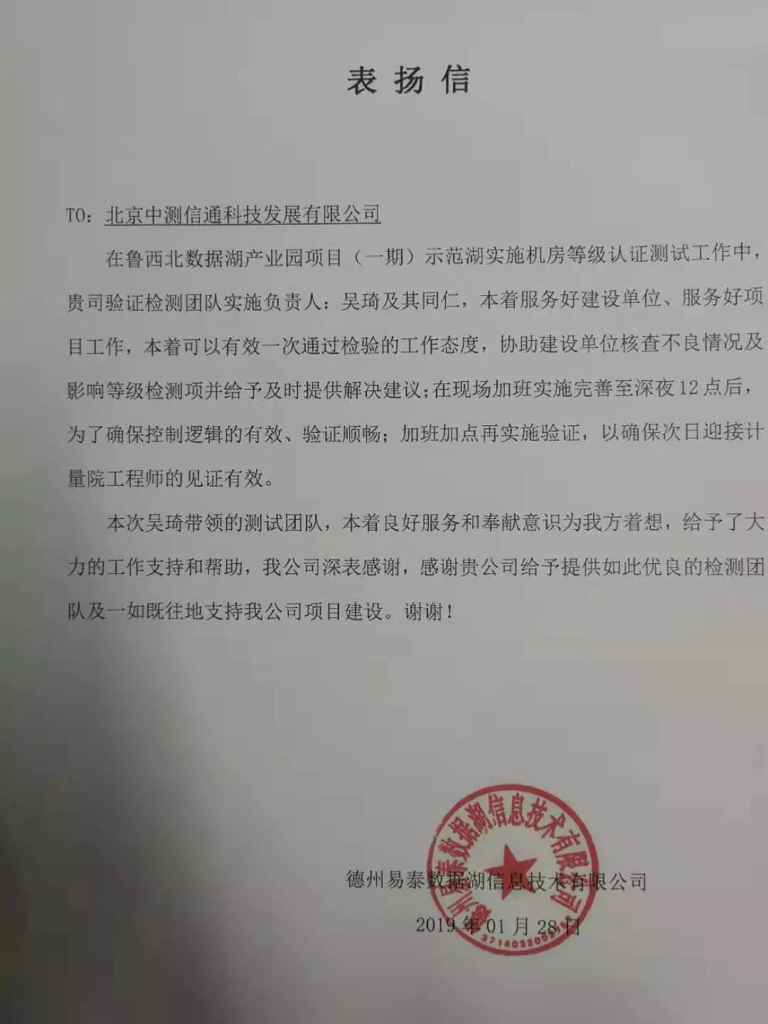 在魯西北數(shù)據(jù)湖產(chǎn)業(yè)園區(qū)項目(一期)示范湖實施機房等級認證測試的工作中,由項目經(jīng)理吳琦帶領的測試團隊,本著服務業(yè)主單位,同時有效且一次通過檢驗的工作態(tài)度,加班加點實施測試,最終出色的完成測試!業(yè)主對此次工作給與好評并提出書面表揚!