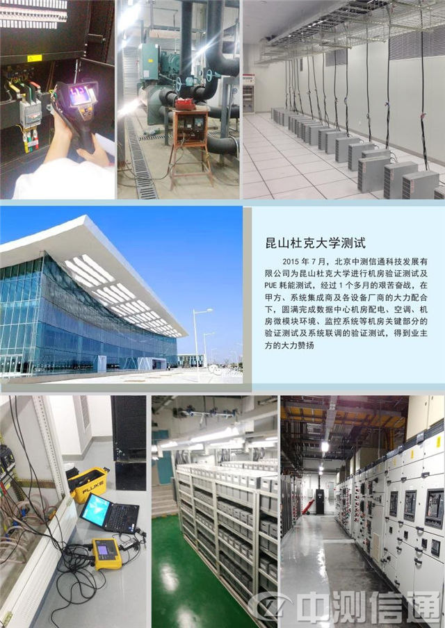 2015年7月,北京中測(cè)信通科技發(fā)展有限公司為昆山杜克大學(xué)案例進(jìn)行機(jī)房驗(yàn)證測(cè)試及PUE耗能測(cè)試,經(jīng)過(guò)艱苦奮戰(zhàn),在甲方、系統(tǒng)集成商及各設(shè)備廠商的大力配合下,圓滿完成數(shù)據(jù)中心機(jī)房配電、空調(diào)、機(jī)房微模塊環(huán)境、監(jiān)控系統(tǒng)等機(jī)房關(guān)鍵部分的驗(yàn)證測(cè)試及系統(tǒng)聯(lián)調(diào)的驗(yàn)證測(cè)試,得到業(yè)主方的大力贊揚(yáng).