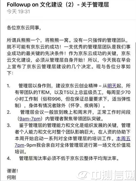 從爆料人提供的郵件截圖來看,自明天(具體日期不詳)起,京東云所有帶團(tuán)隊(duì)的T和M,以及T5以上總監(jiān)級(jí)員工,實(shí)行每周至少70小時(shí)工作制,身體有情況者除外。在保證總量的情況下,可適當(dāng)實(shí)行彈性制。