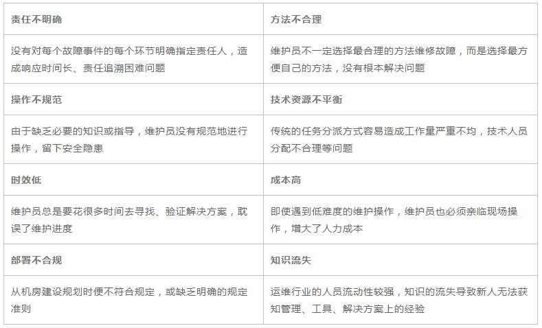 雖然大多數(shù)據(jù)中心已經(jīng)進(jìn)入到了智能化運(yùn)維的階段,但依然有一部分?jǐn)?shù)據(jù)中心還在采用傳統(tǒng)的運(yùn)維模式,每天通過(guò)人工去頻繁地監(jiān)測(cè)、維護(hù)、部署。這種模式過(guò)度依賴運(yùn)維人員的技能、經(jīng)驗(yàn)和責(zé)任心,很容易導(dǎo)致故障的重復(fù)發(fā)生,甚至引發(fā)其他更嚴(yán)重的問(wèn)題。