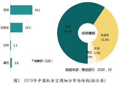 按照制冷冷源不同,機(jī)房空調(diào)可以分為風(fēng)冷型、水冷型和冷凍水型。隨著數(shù)據(jù)中心綠色節(jié)能、高密度、超大規(guī)模的發(fā)展趨勢(shì),特別是大型互聯(lián)網(wǎng)企業(yè)的新建數(shù)據(jù)中心,傳統(tǒng)風(fēng)冷型制冷技術(shù)已經(jīng)無(wú)法滿足所需的散熱能力,冷凍水型制冷系統(tǒng)在高效制冷和大制冷量方面的優(yōu)勢(shì),推動(dòng)了其較快推廣。據(jù)賽迪顧問(wèn)統(tǒng)計(jì),從市場(chǎng)需求和銷(xiāo)售額來(lái)看,風(fēng)冷型制冷仍是目前機(jī)房空調(diào)中的主流機(jī)型,但冷凍水型制冷呈現(xiàn)較快增長(zhǎng)趨勢(shì)。2019年,風(fēng)冷型機(jī)房空調(diào)市場(chǎng)銷(xiāo)售額達(dá)34.1億元,市場(chǎng)占有率為59.4%;冷凍水型機(jī)房空調(diào)市場(chǎng)銷(xiāo)售額達(dá)19.2億元,市場(chǎng)占有率為33.4%,見(jiàn)圖2。