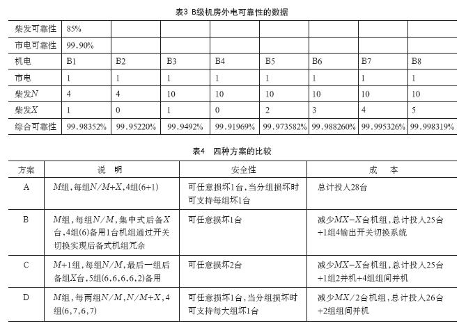 從表2可以看出,當外電引入來自兩個不同高電壓等級變電站(>10kV),不同變壓器,不同路由,完整容量備份得到保證時,從實際需求來講,將投資花在柴發(fā)上僅僅只是可靠性千萬分之一到千萬分之五的增加,而實際上供電可靠性還串聯(lián)著后端用電側(cè)變壓器、配電設備和路由的可靠性。好鋼要用在刀刃上,如果是自用型客戶或者定制型客戶能夠接受的前提下,建議可以考慮無柴發(fā),而將投資放在后端,甚至是運維人員的能力提升上,都好過放在柴發(fā)上。