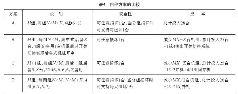 在表4中,A屬于常見型,D屬于有案例,B、C均只屬于理論可行,其中B屬于硬件后備式冗余,C屬于軟件后備式冗余。C的備用組也可以僅設置1臺機組。當項目規(guī)模較大,比如3萬機柜,18組每組6臺,可考慮設置一組備用6臺,直接進行負載切換,而不需要組間并機,可以視為C的一種變型。