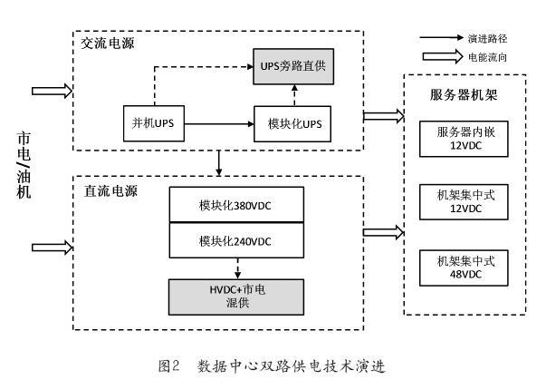 現(xiàn)在隨著高壓直流供電系統(tǒng)的發(fā)展,一路市電+一路高壓直流保障電源的供電方案逐漸興起,該供電方案既利用了市電無轉(zhuǎn)換損耗直接為負(fù)載供電的特性,又在保障電源側(cè)由電池組直接為負(fù)載提供斷電保障,系統(tǒng)可用度比后備式UPS系統(tǒng)提高很多,互聯(lián)網(wǎng)公司已經(jīng)在自用數(shù)據(jù)中心中小批量使用。
