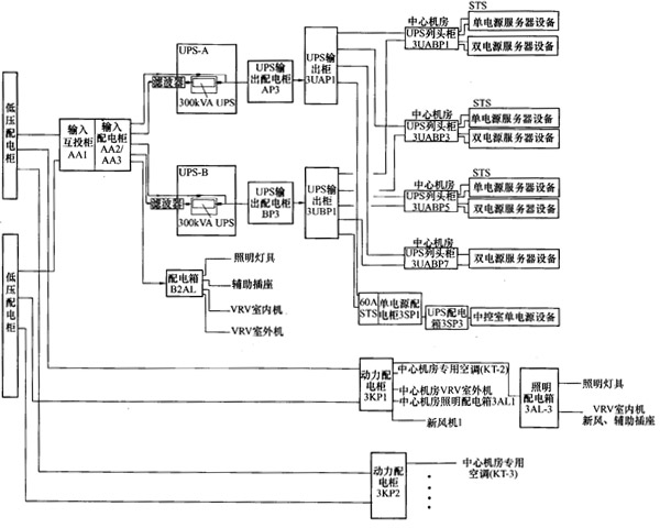 智能建筑中的機(jī)房用電,如計(jì)算機(jī)機(jī)房、數(shù)據(jù)中心、網(wǎng)絡(luò)機(jī)房、消防和安防控制室、電梯機(jī)房等用電,都屬于一級(jí)符合,要有確切的保障措施。有些數(shù)據(jù)傳輸系統(tǒng)是不允許斷電的,需UPS電源支持,否則,若發(fā)生斷電事故,會(huì)造成中達(dá)經(jīng)濟(jì)損失或數(shù)據(jù)丟失。因此,電源保障和供電可靠性在智能建筑的機(jī)房建設(shè)中顯得格外重要。