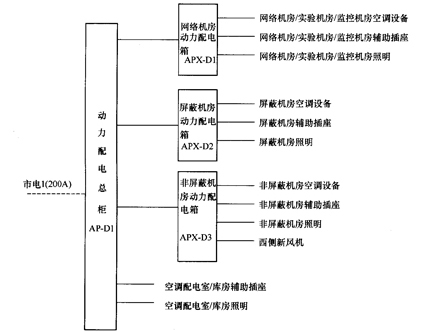 由總配電柜饋出的動(dòng)力供配電系統(tǒng)采用50Hz交流電,380/220V三相五線電源,TN-S接地方式,零線和地線分開設(shè)置且零地線之間電壓小于1V。動(dòng)力配電柜、照明配電箱采用放射式配電直接配至各用電設(shè)備,如下圖所示: