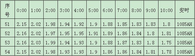 在多種容量測試方案的選擇上,受資金和設備的制約,實際工作中更多采用在線容量測試,由于后端負載穩(wěn)定,以恒電流放電,根據(jù)放電電流的大小,又分為10小時率放電測試,3小時率放電測試等。因為本項目中電池放電電流在100A左右,并對應電池廠家提供的(蓄電池恒電流表/恒功率表)查得,此電池的10小時率放電電流為108.5A,故實際電流滿足測試要求。