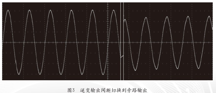 圖3顯示在線式UPS從逆變輸出間斷切換到旁路輸出的波形圖。此時,旁路市電電壓與逆變輸出的電壓差大于20%。根據(jù)該UPS的設(shè)置,此時逆變輸出和旁路輸出電壓相差過大,從逆變輸出到旁路輸出的切換是通過間斷切換來實現(xiàn)的。在切換過程中,有一個短時間的斷電過程,此時逆變器和旁路市電均不向負(fù)載供電,但由于UPS內(nèi)部存在電容等儲能元件,所以輸出電壓并不是立即回到零,而是緩慢下降。此時的電壓是靠UPS內(nèi)部的儲能元件放電來維持。圖中兩個縱向游標(biāo)之間即為斷電過程,這一過程的持續(xù)時間為3.0ms。