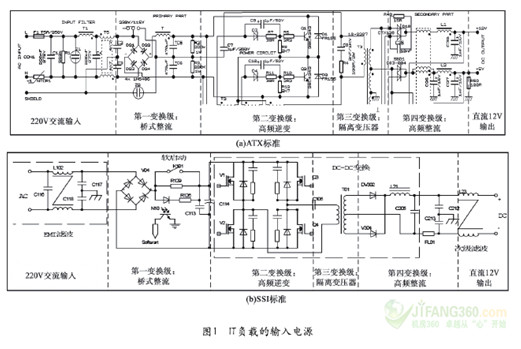 當(dāng)前IT負(fù)載內(nèi)部的輸入電源模塊基本上采用兩種標(biāo)準(zhǔn)制式,即ATX制式和SSI制式。這兩種制式電源的主電路如圖1所示。