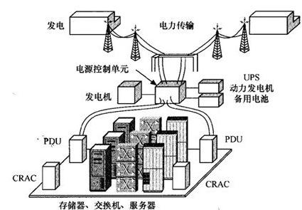 為了在停電期間和發(fā)電機啟動并提供穩(wěn)定電力之前的短時間內(nèi)可以繼續(xù)用電,通常使用不間斷電源(UPS)系統(tǒng)。電源管理開關(guān)可以手動或自動地在電力公司供電和自發(fā)電之間切換,以便進行維修、診斷和故障排除,或者用于帶有負(fù)載平衡的維修旁路。配電器(PDU)可以把來自電源管理系統(tǒng)的高壓電轉(zhuǎn)變?yōu)镮T設(shè)備所需的電力。電纜可以鋪設(shè)在架空地板的下方或高架管道中。通常PDU可以遍布數(shù)據(jù)中心的不同位置,為服務(wù)器、存儲器、網(wǎng)絡(luò)設(shè)備以及計算機機房空調(diào)(CRAC)和HVAC提供電力。