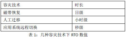 RTO(RecoveryTimeObjective,復(fù)原時(shí)間目標(biāo))是數(shù)據(jù)中心可容許服務(wù)中斷的時(shí)間長(zhǎng)度。比如說(shuō)服務(wù)發(fā)生后半天內(nèi)便需要恢復(fù),RTO數(shù)值就是十二小時(shí)。RTO具體時(shí)間長(zhǎng)短只是從故障發(fā)生后,從數(shù)據(jù)中心系統(tǒng)宕機(jī)導(dǎo)致應(yīng)用停頓之刻開(kāi)始,到數(shù)據(jù)中心系統(tǒng)恢復(fù)至可以支持各部門(mén)運(yùn)作之時(shí),此兩點(diǎn)之間的時(shí)間段。RTO是反映數(shù)據(jù)中心業(yè)務(wù)恢復(fù)的及時(shí)性指標(biāo),表示業(yè)務(wù)從中斷到恢復(fù)正常所需的時(shí)間,RTO數(shù)值越小,代表容災(zāi)系統(tǒng)的數(shù)據(jù)恢復(fù)能力越強(qiáng),數(shù)據(jù)中心可以部署很多容災(zāi)系統(tǒng),來(lái)獲取最小的RTO,但這意味著投入大量資金。提升RTO的常用技術(shù)有:磁帶恢復(fù)、人工遷移、應(yīng)用系統(tǒng)遠(yuǎn)程切換,這幾種技術(shù)的RTO的表現(xiàn)如表1所示: