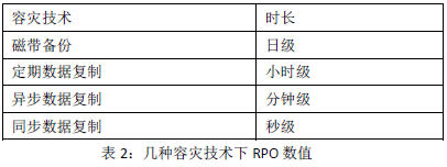 RPO(RecoveryPointObjective,復(fù)原點(diǎn)目標(biāo))是指數(shù)據(jù)中心能容忍的最大數(shù)據(jù)丟失量,是指當(dāng)業(yè)務(wù)恢復(fù)后,恢復(fù)得來(lái)的數(shù)據(jù)所對(duì)應(yīng)時(shí)間點(diǎn),RPO取決于數(shù)據(jù)中心數(shù)據(jù)恢復(fù)到怎樣的更新程度,這種更新程度可以是上一周的備份數(shù)據(jù),也可以是昨天的數(shù)據(jù),這和數(shù)據(jù)備份的頻率有關(guān),為了改進(jìn)RPO,必然要增加數(shù)據(jù)備份的頻率才行。RPO是反映數(shù)據(jù)中心恢復(fù)數(shù)據(jù)完整性的指標(biāo)。在同步數(shù)據(jù)復(fù)制方式下,RPO等于數(shù)據(jù)傳輸時(shí)延的時(shí)間,在異步數(shù)據(jù)復(fù)制方式下,RPO基本為異步傳輸數(shù)據(jù)排隊(duì)的時(shí)間。提升RPO的常用技術(shù)有:磁帶備份、定期數(shù)據(jù)復(fù)制、異步數(shù)據(jù)復(fù)制、同步數(shù)據(jù)復(fù)制等,這幾種技術(shù)的RPO的表現(xiàn)如表2所示: