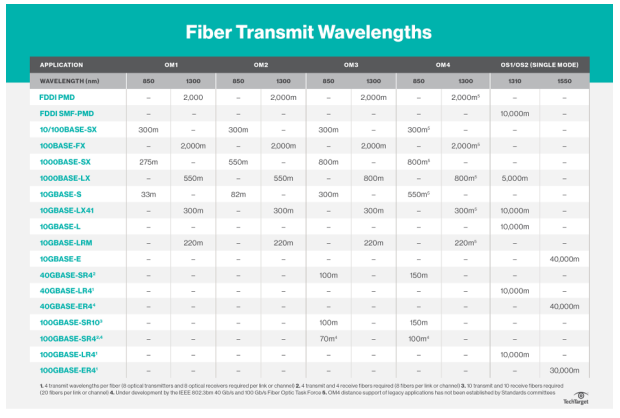 光纖傳輸速率取決于光纖的距離、直徑以及用于在光纖上遷移光的光源。單模光纖被設(shè)計用于長距離的應(yīng)用程序,而多模光纖通常用于較短的上行鏈路,服務(wù)器到交換機(jī)和骨干應(yīng)用程序。公布的標(biāo)準(zhǔn)所支持的距離如下。