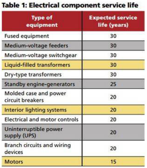 如維護(hù)保養(yǎng)得當(dāng),建筑中商業(yè)級配電系統(tǒng)的使用年限通常在20至30年,配電組件使用年限如下表: