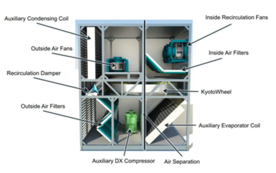 利用Kyoto wheel(滾動式熱交換器)作為過濾器更好的改善這個問題。它由一個通過兩部分空間旋轉(zhuǎn)的金屬輪組成。 當冷空氣通過第二部分進入時,中心的熱空氣流過一個空間。 當熱空氣流過一個空間時,熱量傳遞到車輪的金屬中,然后空氣流回數(shù)據(jù)中心,而外部空氣則從金屬吸收熱量。