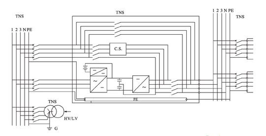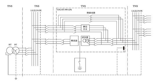 從圖1中可以看出,在UPS上下線都是TN-S接地方式時,由晶閘管整流器組成的UPS或稱之為工頻機(無論這個稱呼是否準確),其中性線N是由UPS的旁路輸入端引入的,并且與逆變變壓器(而不是起“隔離”作用的變壓器)的中性點直接連接,作為UPS輸出的中性線。這種連接方式的目的是:由于UPS的靜態(tài)旁路時時刻刻處于“待切換”的鎖相同步狀態(tài),當負載需要從逆變器供電切換到由靜態(tài)旁路供電(或相反切換)時,為了避免兩路交流電源切換時由于基準電位不一致而產(chǎn)生較大的環(huán)流,導(dǎo)致切換失敗,因此這兩路電源的基準電位必須是一致的,在電路上是采用同一條中性線的連接作為基準電位來保證。