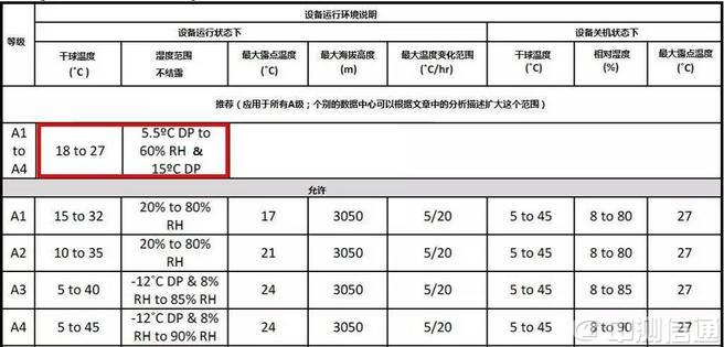 ASHRAE TC 9.9-2011 Thermal Guidelines for Data Processing Environments-Expanded DataCenter Classes and Usage Guidance (2011 數(shù)據(jù)處理環(huán)境散熱指南-延伸到數(shù)據(jù)中心等級與使用指南)[1]中對機房熱環(huán)境的規(guī)定如下(紅色線框內表示數(shù)據(jù)中心A1~A4等級機房的推薦溫濕度)。